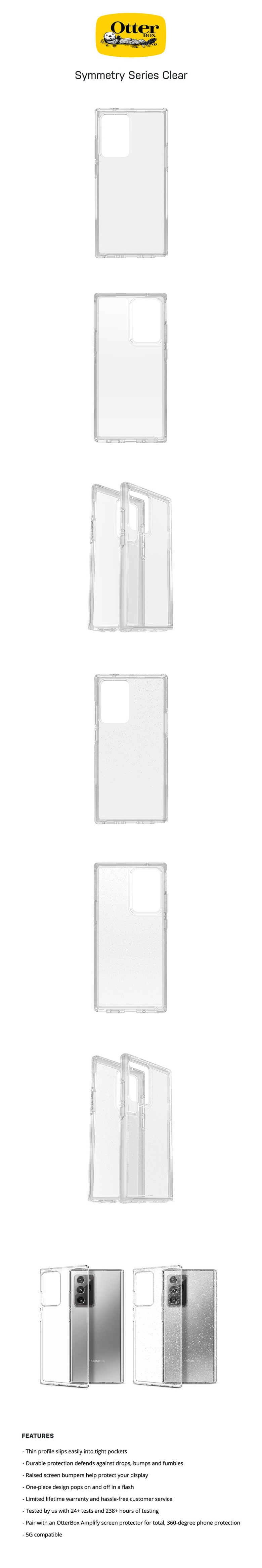 OtterBox Symmetry เคสที่มีความทนทานต่อแรงกระแทกอย่างมีประสิทธิภาพ มาตรฐาน OtterBox Certified Drop Protection วัสดุด้านนอกแข็งปกป้องเครื่อง ด้านในนิ่มออกแบบมาในลักษณะเป็นทรงสี่เหลี่ยมรูปเพชร ช่วยป้องกันรอยขีดข่วนและดูดซับแรงกระแทกได้ดี ตัวเคสมีรูปทรงที่เพรียวบางสามารถ ยกขอบด้านข้างสูงเพื่อปกป้องหน้าจอ ด้วยการออกแบบที่เรียกว่า one-piece design ทำให้สวมใส่และถอดออกได้ง่ายและรวดเร็ว มีให้เลือก 2 แบบ เคสใส และ กากเพชร