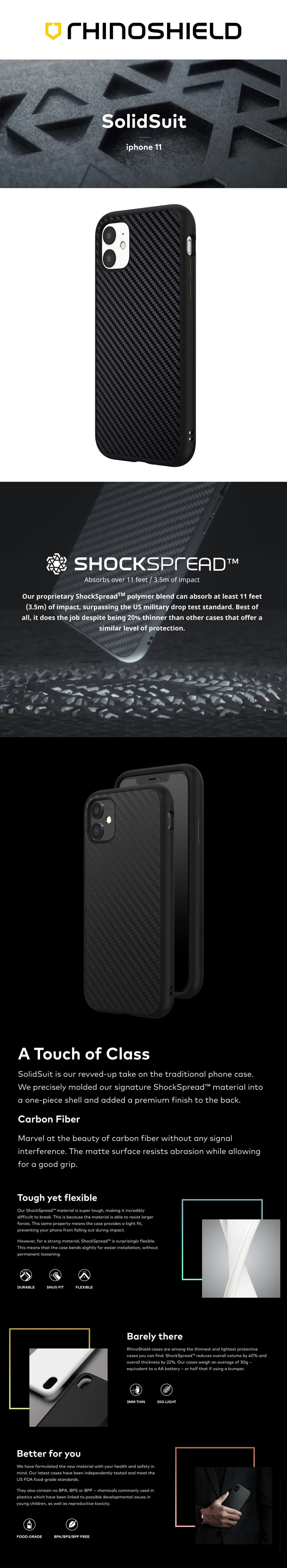 RhinoShield SolidSuit [Carbon Fiber] for iPhone 11 เพรียวบางแต่ให้การปกป้องระดับพรีเมียม เคส RhinoShield SolidSuit สำหรับ iPhone 11 เคสผลิตจากโพลิเมอร์และโพลียูรีเทนคุณภาพดีเยี่ยม เป็นการผสมผสานโพลิเมอร์ ซึ่งเป็นลิขสิทธิ์เฉพาะของแบรนด์ RhinoShield เท่านั้น ทำให้เคสมีความกระชับ ทนทาน และยากต่อการแตกหักเพราะมีความยืดหยุ่นสูง มีเทคโนโลยี ShockSpread™ สามารถดูดซับและกระจายแรงกระแทกจากการตกจากความสูงได้อย่างน้อย 3.5 เมตร จากการทดสอบมาตฐานของเคสกันกระแทก