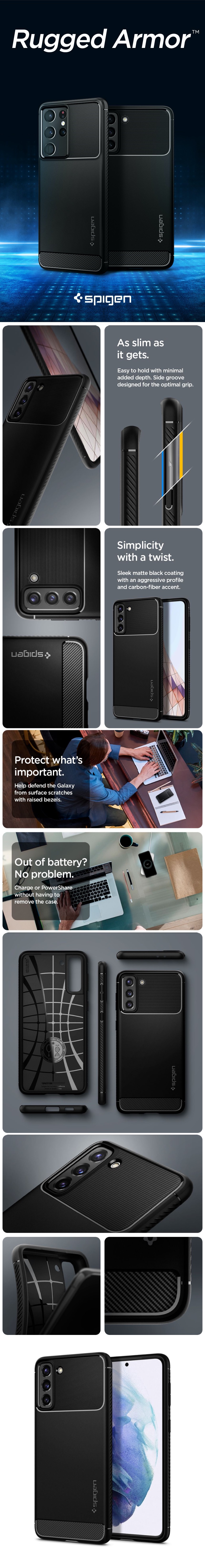 ความทนทานรูปใหม่แบบของ Spigen Rugged Armor การปกป้องที่มีสไตล์ ตัวเคสผลิตจาก TPU พื้นผิวนุ่มมีความยืดหยุ่นสูง โดยได้แรงบันดาลใจจากการออกแบบรถยนต์ เพิ่มลวดลายคาร์บอนไฟเบอร์มีความมันวาว ตัวเคสเพรียว บาง กระชับกับตัวเครื่อง มีเทคโลโลยี Air Cushion ช่วยดูดซับแรงกระแทก ที่ได้รับการรับรองจาก MIL-STD 810G-516.6 ซึ่งเป็นมาตรฐานการทดสอบความแข็งแรงของเคส
