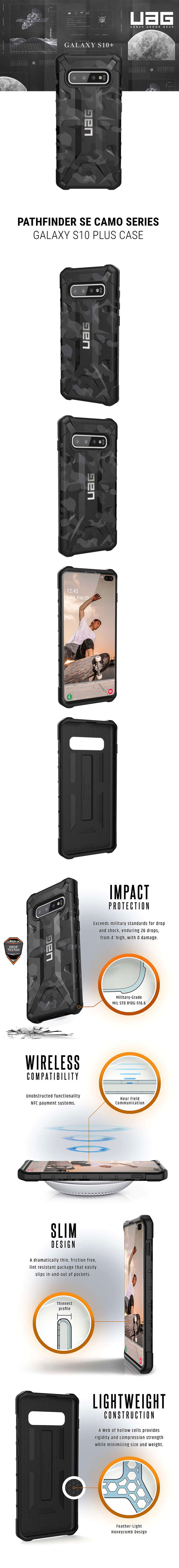 UAG (Urban Armor Gear) Pathfinder SE Camo รุ่นพิเศษลายทหาร การป้องกันแบบเกราะกันกระแทกรอบตัว ดัวยวัสดุที่มีการจดสิทธิบัตร ด้านนอกมีลักษณะแข็ง หุ้มด้วยยางกันกระแทกลายรวงผึ้งด้านใน ช่วยกระจายแรงกะแทก น้ำหนักเบารูปทรงอันเป็นเอกลักษณ์เฉพาะ น้ำหนักเบาลงตัวกับ Galaxy S10 Plus ของคุณ